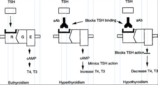 Graves’ – a result of activated B cells attaching to TSH receptors on follicular cells