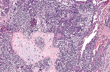 - better px if arises in cervix of younger pts, slightly older pts can have DICER-1 mutation; must alert physician to possible presence of lung tumors or ovarian sex cord-stromal tumors