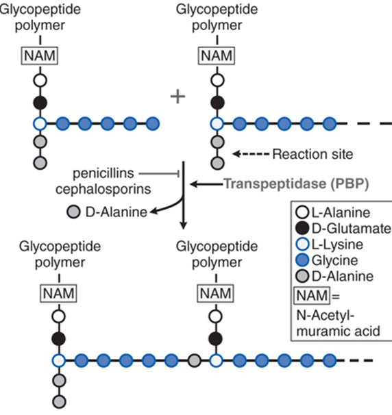 - PBPs are transpeptidases that are involved in the final stages of the synth of peptidoglycan (a major component of cell walls)
