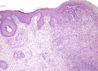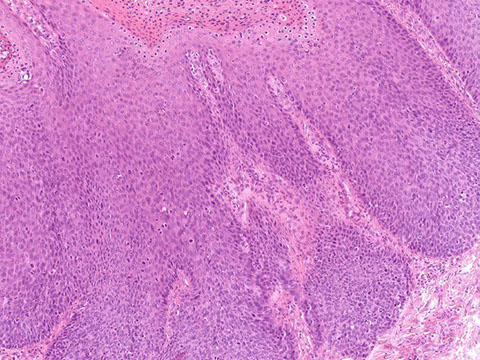 DDx: reparative pseudoepitheliomatous hyperplasia 2/2 other dz process (can be profound and have squamous pearls)