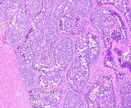 • Basaloid neoplastic cells surrounded by a thick basement membrane arranged in a jigsaw pattern and displaying hyaline globular inclusions