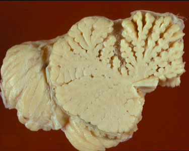 The anterior portion of the vermis (upper portion of figure) is atrophic with widened spaces between the folia