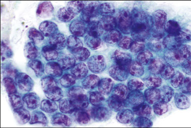 Cells show mild variation in size and have eccentrically located oval nuclei (plasmacytoid appearance). “Salt and pepper” chromatin