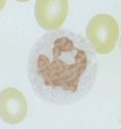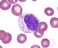 Basophil - ref range 0-1%, or <0.1 x 10^9; assoc c allergy, also neoplasia / dysplasia sometimes, 12 microns, nucleus bilobed but usually obscured by dark blue polymorphic granules, same nuclear chromatin as neutro
