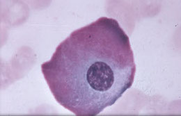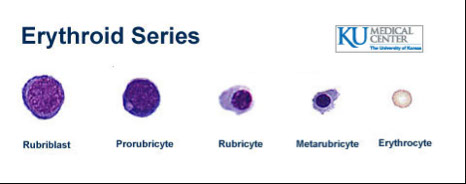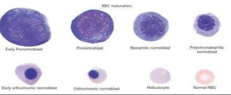 CD Markers-CD45RA; Size: 10-18 µm (close to a mature cell); N:C ratio 2:1; Nucleus may be eccentric (less golgi) but is more clumped, less red more blue; No / rare nucleoli (less mitoses); Cytoplasm clear to bluish-pink (still some RNA activity)c 20 granules appear; Specific to N, B, E