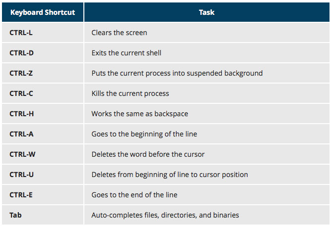 Shell - command line interpreter that interprets the command line input and instructs the OS to perform any necessary tasks and commands (ie bash, tcsh, and zsh ("zshell")