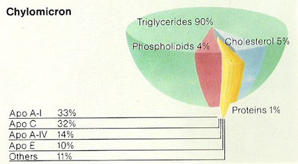 52% triglyceride, 22% cholesterol, 18% phospholipid, 8% protein
