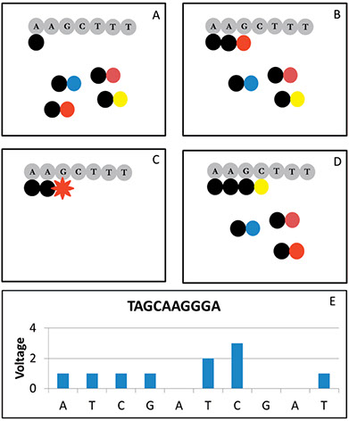 Illustration of Illumina sequencing by synthesis (Athrough D) and Ion Torrent ion-based sequencing (E). A, Fluorescently tagged nucleotides (blackcircles with colored circles) compete for the next complementary space on the DNA strand (gray circles). B,When a fluorescently tagged nucleotide is incorporated, it blocks further addition of nucleotides. C, The flowcell is washed, removing additional fluorescently tagged nucleotides, and a laser signal leads to fluorescent emission. D, The fluorescent tag and blocker are removed and washed away, allowing incorporation of the next base during the next cycle. This occurs simultaneously for all DNA strands in a cluster and all clusters on the flowcell. E, In each cycle, a single base is added in a set pattern. For this example, the order of base additions is A, T, C, and G, which then repeats. If a base is incorporated an ion is released, leading to a pH(voltage) change that is proportional to the number of bases added in a row. Reprinted from Yohe SL. Hot topic spotlight—new frontiers in clinical next-generation sequencing. In: Cushman-Vokoun AM, AndersonWB, eds. Precision Medicine Resource Guide. Northfield, IL: College of American Pathologists; 2016:13–14. With permission from College of American Pathologists. Copyright 2016.