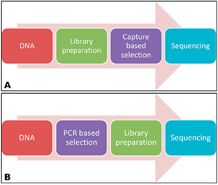 A, Overview of wet bench steps for capture-based sequencing. DNA undergoes library preparation followed by capturebased selection before sequencing. B, Overview of wet bench steps for polymerase chain reaction (PCR)–based sequencing. The PCR selection step occurs before library preparation or may be combined with the librarypreparation step in PCR-based sequencing.