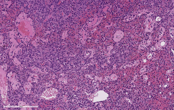 - Numerous blood vessels show hyalinized walls