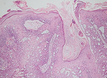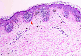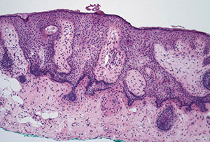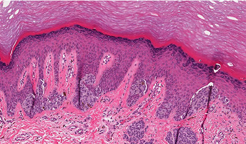 - epidermis usually has some atrophy c flattening of rete pegs