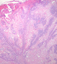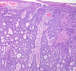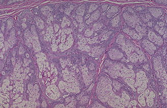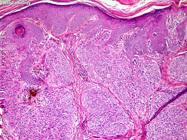 Early - well circumscribed solid lobules of large pale sq cells c little keratinization; mild atypia and distorted follicular infundubuum