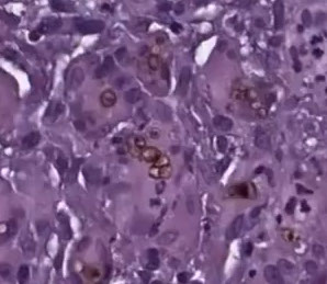 Micro: necrotizing granuloma of subcutis c spherical organisms c central basophilia, internal septation and double layer walls