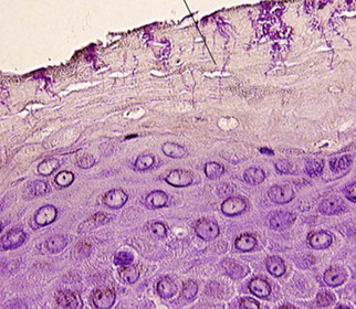 Stratum Basalis - where stem cells reproduce squamous cells, pushed upward; pink bc filled c keratin