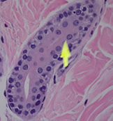 Sebaceous glands - cells have white spaces in it as artifact bc used to have lipid in them