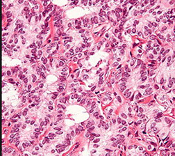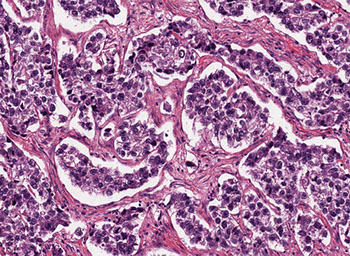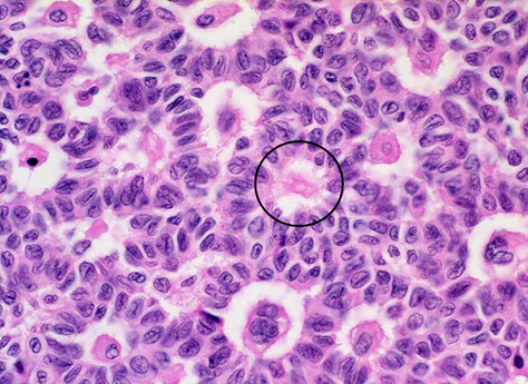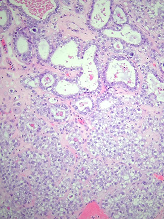 Micro: small cells with brisk mitotic activity, arranged in sheets, nests, trabeculae, or cords, with follicle-like spaces with eosinophilic to basophilic secretions.