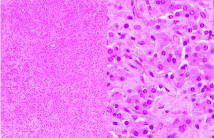 - Some have a large cell component with abundant eosinophilic cytoplasm, large vesicular nuclei, and prominent nucleoli.