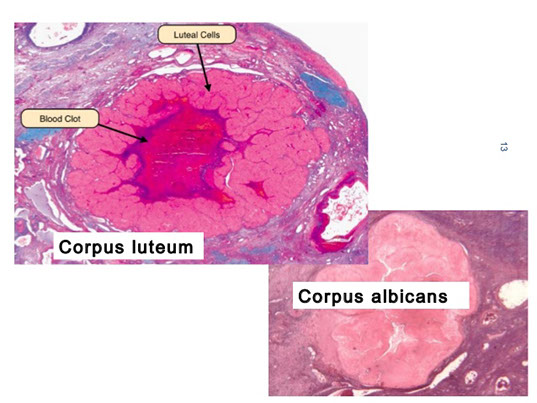 Follicular structures: cystic follicles, yellow corpora lutea, white corpora albicantia