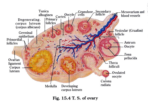 - Corona radiata: oocyte with zona pellucida and single layer of granulosa cells that breaks off to float in antrum