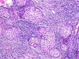 - diffuse prolif of monotonous spindle cells and can have nuclear grooves and Call-Exner bodies