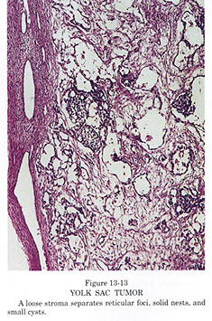 Micro: primitive germ cells and sex cord stromal cells in nests separated by ovarian-type, fibrous stroma