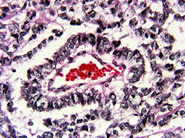 Micro: irregular tubular spaces of multiple sizes made of flat endothelioid cells, cytoplasmic vacuoles, clusters of cells; occasional big cells c red cytoplasm, sm muscle hyperplasia,