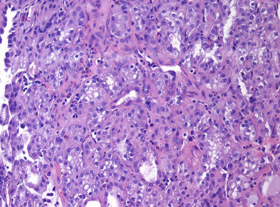 - prolif of small solid to hollow tubules lined c low columnar to cuboidal epithelium c red cytoplasm