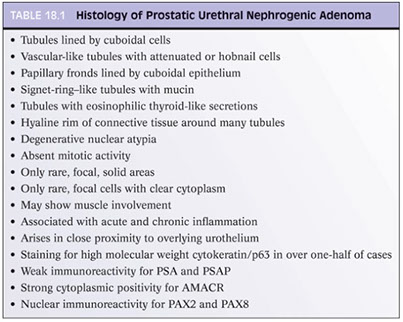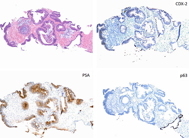 Nephrogenic adenoma: AE1/3+, p63+, PSA+, CAM5.2+, AMACR+, PSMA+