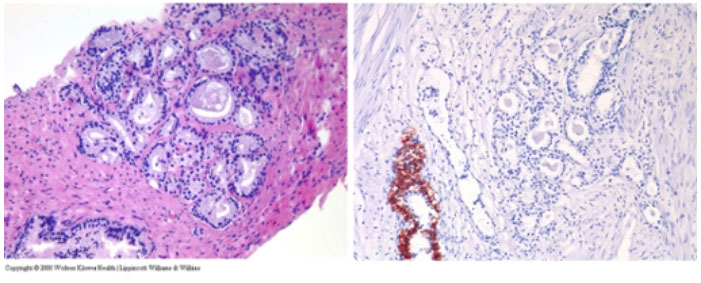 - basal cells are absent in adenocarcinoma of the prostate and can be found in conditions that mimic prostate cancer