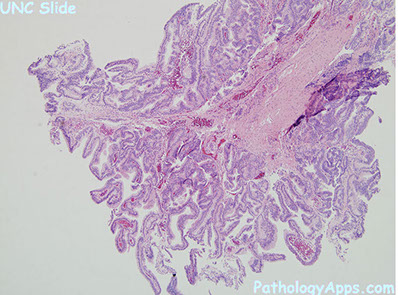- glandular part made of small and large acini, some c papillary infoldings and projections c central fibrovascualr core (not a specific finding)