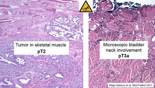 - extension into preprostatic fat, seminal vesicles, muscle of bladder neck