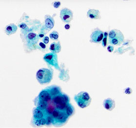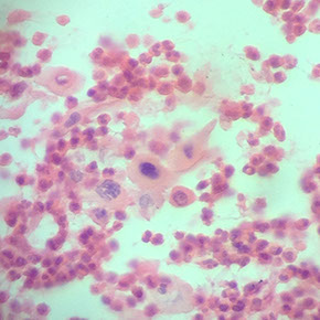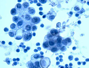 Micro: clusters or single cells c irregular nuclei, multiple prominent nucleoli, feathery cytoplasm, prominent chromatin clearing, inc mits