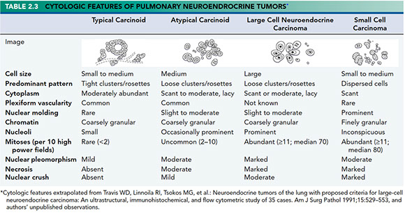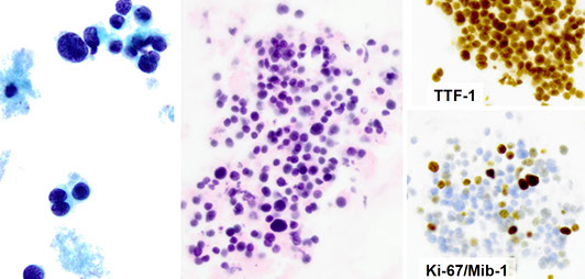 Nuclear molding and variable hyperchromasia (from moderate to opaque); chromatin is coarser than adenoca and finer than carcinoid, and is evenly distributed and powdery; nuclei round to slighlt oval and freq irreg c rounded sides - smudging of nuclei is also characteristic