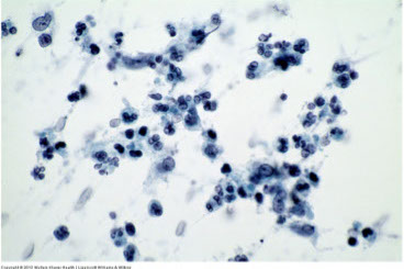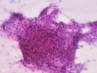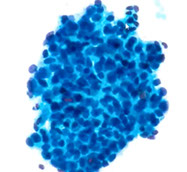 Cyto: virtually identical to small cell ca of lung, c loosely cohesive clusters of round to oval small cells  c dark nuclei, no nucleoli, high NC, nuclear molding and freq mits in a cellular smear c necrosis