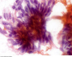 Cyto: Single and loosely grouped pleomorphic mucinous (glandular) cells found in low-grade tumors are cuboidal to columnar c irreg nuclear contours, coarse and clumped chromatin and prominent nucleoli and can be similar to muciphages, goblet cells or signet-ring shaped c lots of mucin;