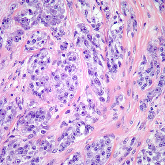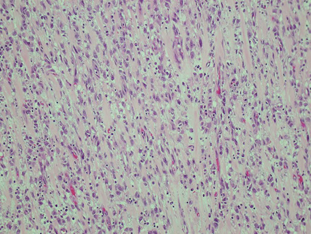 Micro: Sheets of polygonal, whorled, slightly fusiform cells with neuroid differentiation, mits and atypia