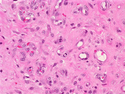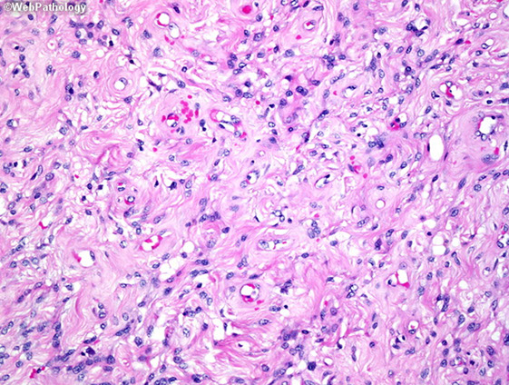 Micro: "Patternless" or haphazard pattern c hypo- to hyper cellular areas between thick hyaliized collagen, cracking artifact, staghorn vessels (HPC-like vessels)