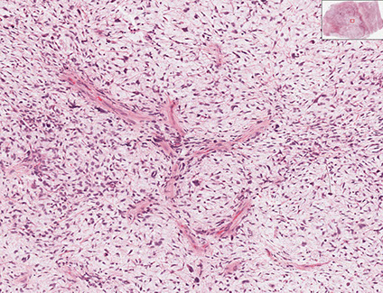 Monophasic tumor is densely packed c uniform spindle cells in fascular sheets c pseudorosettes; also have abundant hemangiopericytomatoid vascularity and freq mits