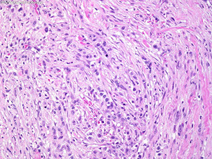 Micro: monomorphic snake-like cells c palisading,big vascular spaces, plump tumor cells around vessels, palisading necrosis (like GBM), freq mits, atypia, metaplastic cartilage, bone and muscle