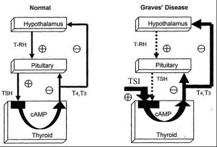 Graves’ – a result of activated B cells attaching to TSH receptors on follicular cells