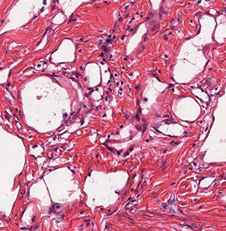 - spaces usually have hyaluronic acid, which can stain c acid mucin stains