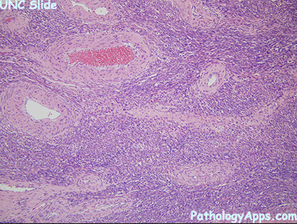 Uncommon, in uterus or cervix, made of epithelioid or spindly cells c red to clear cytoplasm in fascicular, nested or solid pattern around BVs, which can be prominent and delicate or thicker